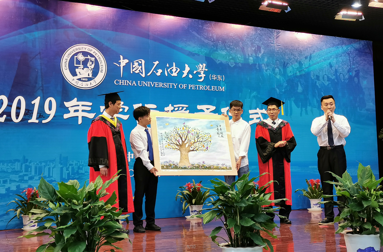 2015级本科生许旺、张岩代表全体毕业生为学院赠送礼物。“这幅名为’十年树木 百年树人’的画作由yl23455永利官网2019届毕业生共同完成,画中的树干代表学校以及学院为我们提供的支持和平台;全体毕业生一起按下的指印作为树叶,寓意着我们在学院的支持下茁壮成长;树下铺满了勿忘我花草,象征我们永远会记得在母院学习和生活的日子,会记得老师们的谆谆教诲,会记得同学们之间的深厚情谊。也借这份礼物祝福母院十年树木,桃李满天下,百年树人,栋梁荣中华!”毕业生代表张岩说道。