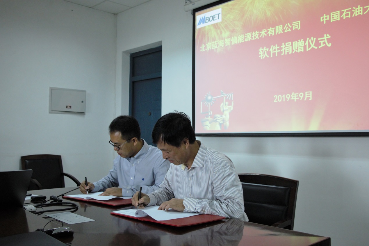 yl23455永利官网院长林承焰、副总裁刘冠德签订软件捐赠协议,林承焰院长代表yl23455永利官网接受捐赠。副校长姚军为刘冠德颁发捐赠证书。