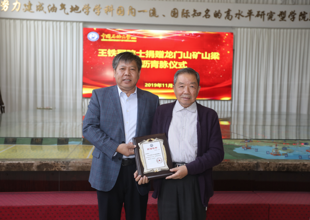 姚军对王铁冠院士的捐赠之举表示感谢,指出学校正处于“双一流”建设关键时期,按照“强化、拓展、提升”的思路调整学科布局,强化石油石化学科,拓展新能源、新材料、海洋学科,提升基础和通用学科。此次捐赠龙门山矿山梁大沥青脉将野外地质现象生动地搬进校园,将助力学校建设一流学科、培养一流人才。我们定将发挥好这块大沥青脉的作用,提高教学科研水平,传承石大精神,丰富石大文化,培养地学英才,为祖国能源事业做出新贡献。