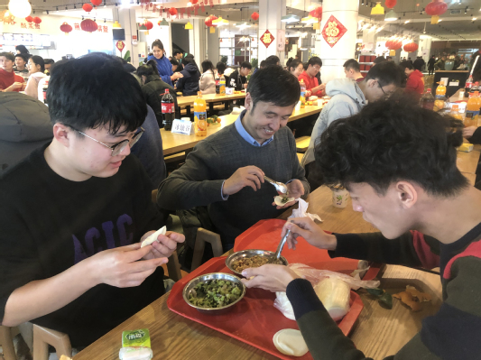 “在课堂和实验室我虚心向老师学知识,但今天我包的饺子和纪老师包的要请大家来评评看。”纪文明老师和他指导的2019级“小学徒”赵蔚然在包饺子的同时也“较着劲儿”尼。