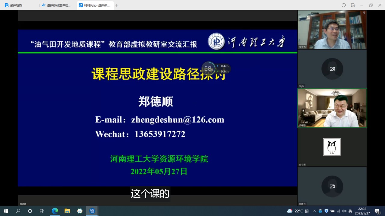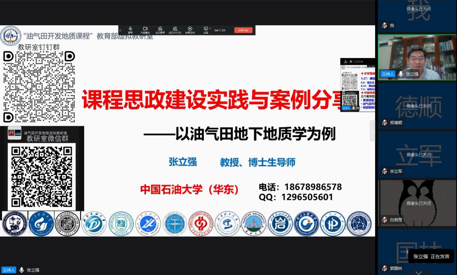 油田开发地质课程教育部首批虚拟教研室建设点从今年3月开始开展了系列研讨活动,规划了教研室2022年工作重点、规范了教学活动时间和相关制度。按照计划,5月27日,油气田开发地质课程教育部虚拟教研室开展了课程思政专题分享和研讨活动。来自中国石油大学(华东)、中国地质大学(武汉)、中国矿业大学(北京)、吉林大学、西北大学、长安大学、中国石油大学(北京)、东北石油大学、西安石油大学、河南理工大学、山东科技大学、青海大学等20余所高校的56名教师参加了本次研讨活动。中国石油大学(华东)张立强教授主持了会议。