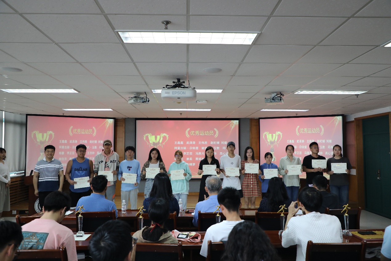 接着,与会领导老师分别为优秀运动队、突出贡献个人、优秀教练员、体育之星、优秀运动员代表、体育运动积极分子代表、优秀志愿者代表颁奖。学生运动员许伟章代表受表彰个人讲话,他通过“感谢与感动”“情怀与执念”“展望与启航”三个方面,回顾了自己通过参与体育运动磨炼蜕变的精彩故事,讲述了全体运动员刻苦训练、永争第一的拼搏事迹,代表全体运动员表达了对学院大力支持的感谢。