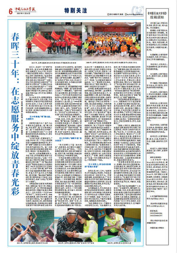 近日,中国石油大学报整版报道我院春晖志愿服务队30年志愿服务事迹,获得师生广泛关注,引发热烈反响,现将相关内容摘录如下。