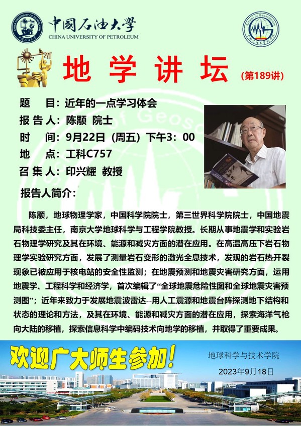 【地学讲坛第189讲】关于陈颙院士《近年的一点学习体会》学术报告的通知