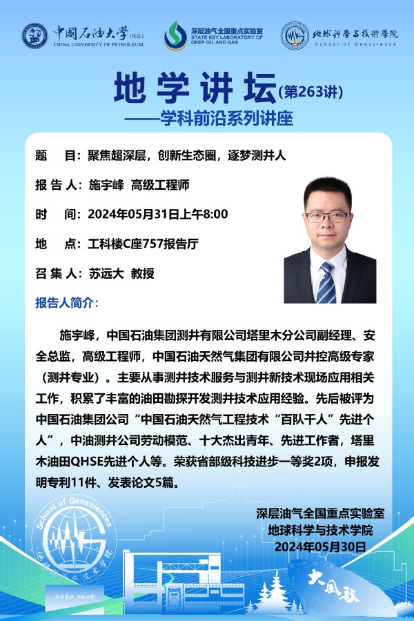 【地学讲坛第263讲】关于施宇峰高级工程师《聚焦超深层,创新生态圈,逐梦测井人》学术报告的通知
