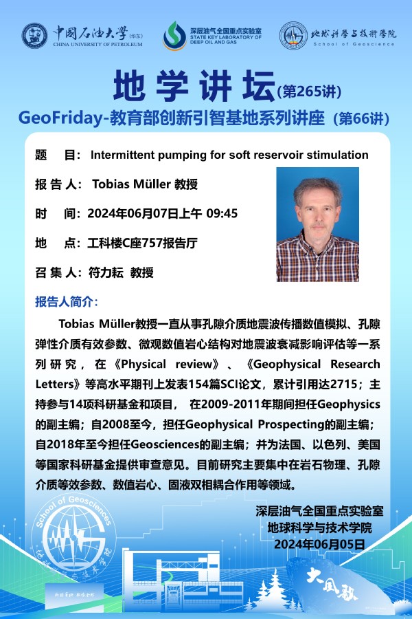 【地学讲坛第265讲】关于Tobias Müller 教授《Intermittent pumping for soft reservoir stimulation》学术报告的通知